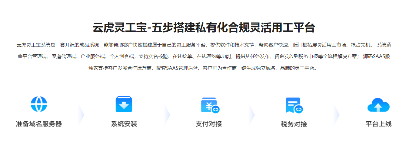 私有化部署项目平均15-30天即可完成部署上线,云虎软件提供全程技术支持,包括系统搭建、人员培训、运维保障、迭代升级,企业无需配备专门的技术团队维护系统,即可拥有自主可控的灵活用工管理平台。