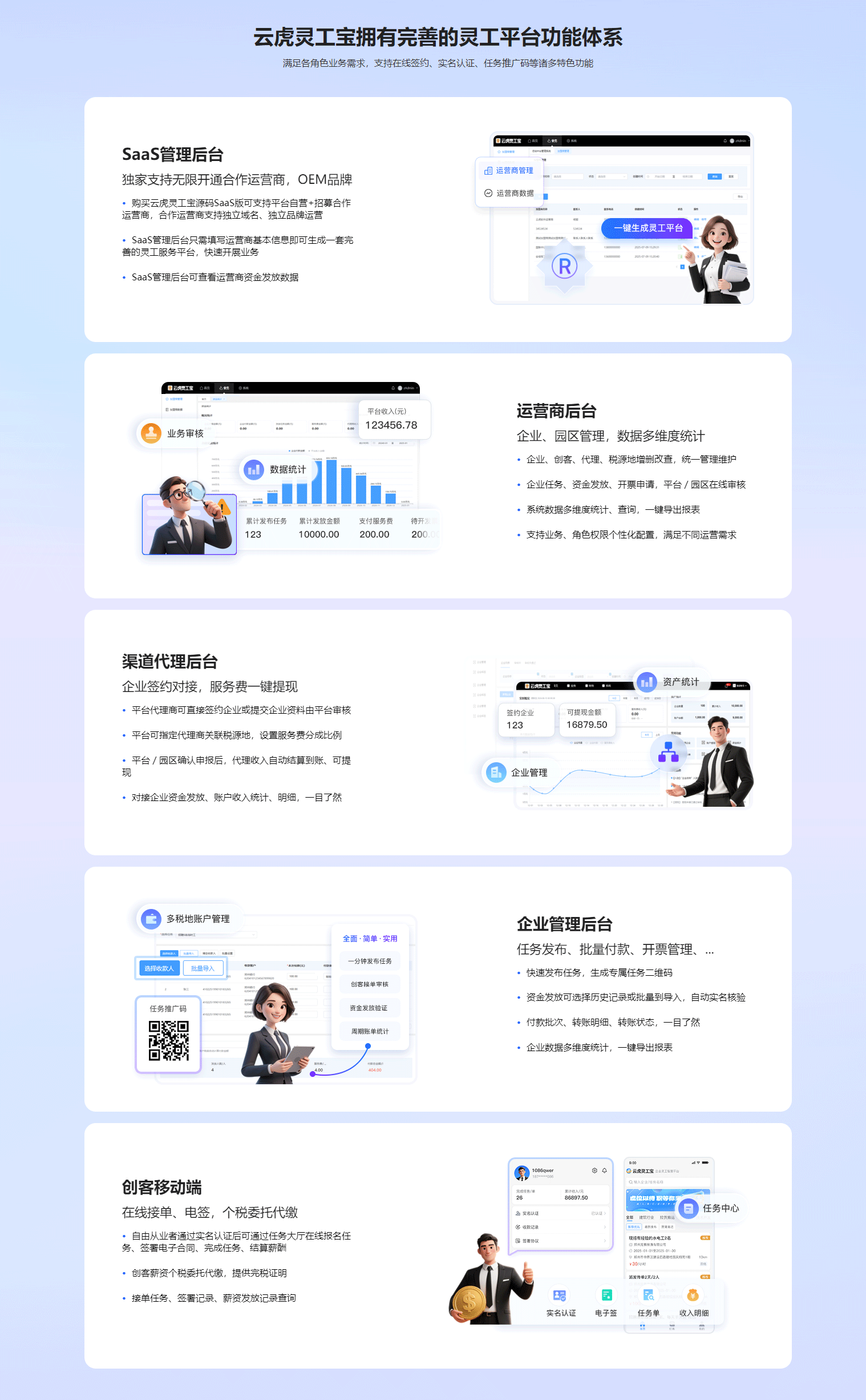 系统包含五大核心功能模块:任务管理支持在线发布任务,创客扫码查看承接;合同管理支持在线实名签署,协议模板自定义配置;资金管理支持对公充值,百万级薪酬批量2小时到账;税务发票支持在线申请,个税代扣代缴完成后自动开具发票;财务统计支持资金统计、月度账单、付款明细一键导出,完全满足企业不同场景的管理需求。