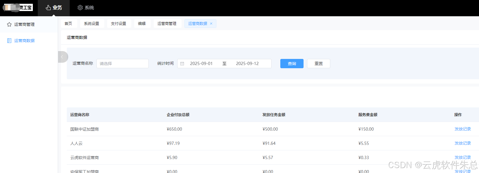 ),支持UI界面、合同模板、结算账户等全要素定制,实现“零代码”快速部署。分级权限管理:总部可设置运营商权限(如任务发布、资金审批、数据查看),例如限制区域运营商仅能查看本地数据,避免信息泄露。